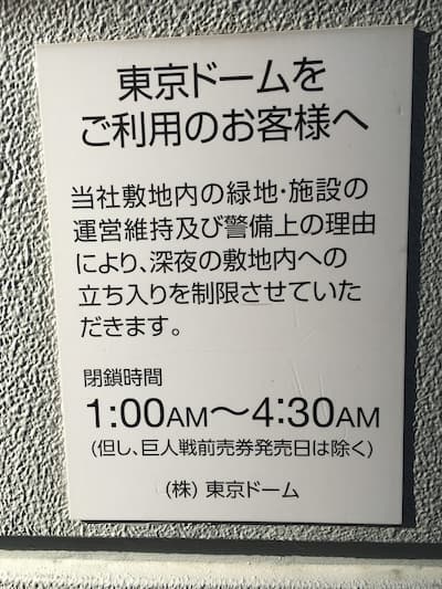 [qa-box01 title="徹夜で並んでも大丈夫?"]東京ドームの敷地はam1:00~am4:30の間は立ち入り制限があるので、徹夜待機は絶対に止めましょう。