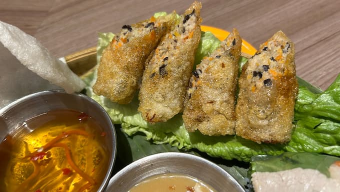 ライスペーパーから透ける海老と野菜が美しいですね。特製のタレ(味噌ピーナッツ風味)をたっぷりつけていただきます。