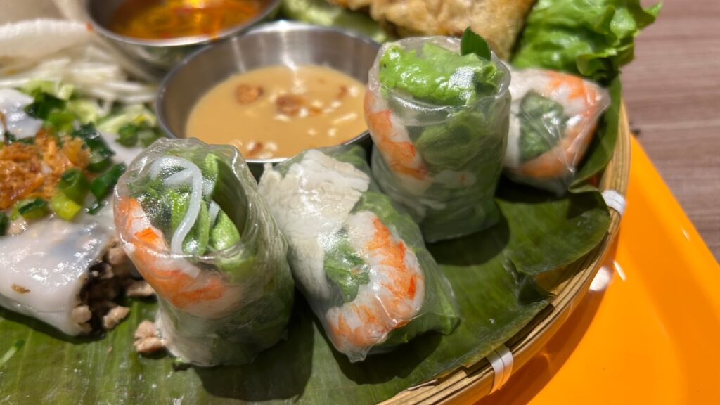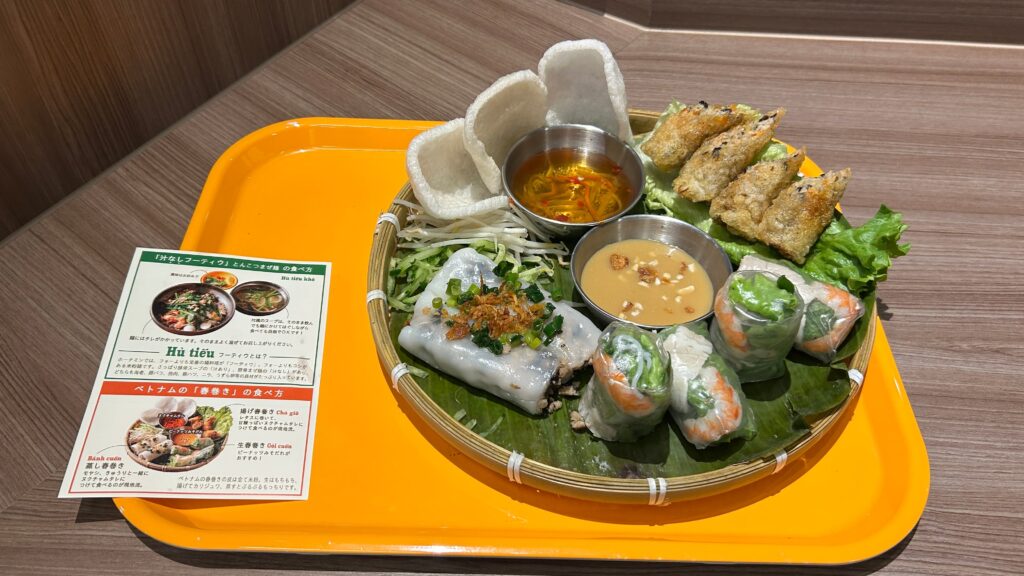「フードコートで1,850円?」と一瞬迷いましたが、出てきたプレートを見て納得。生春巻き、揚げ春巻き、蒸し春巻きが一度に楽しめる、春巻きオールスターズな一皿です。 春巻き3種の盛り合わせ(1,850円)。彩りも鮮やか!