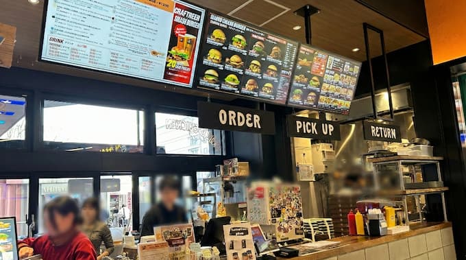 「ORDER」「PICK UP」の大きな看板があり、アメリカンダイナーのような雰囲気です。 活気のあるカウンター。注文カウンターの奥でパティを焼く音が聞こえます