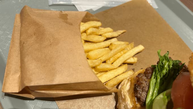 セットのポテトは細めのシューストリングタイプ。揚げたてサクサクで、バーガーの合間の箸休めにぴったりです。 +100円でこの量は良心的。袋に入っているのも食べやすくて◎