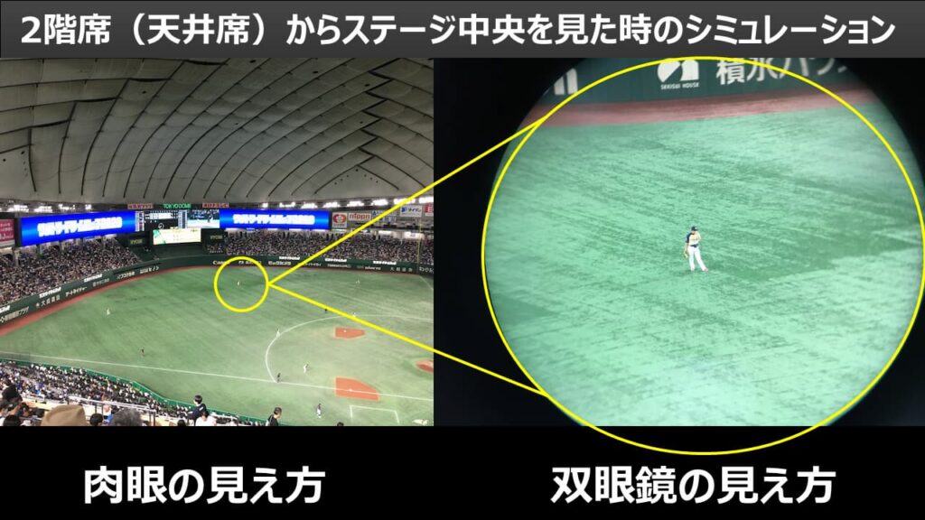 コンサートの場合、2階席からステージ中央を見ると、アーティストは写真右側の円のように、指先ほどのサイズにしか見えません。