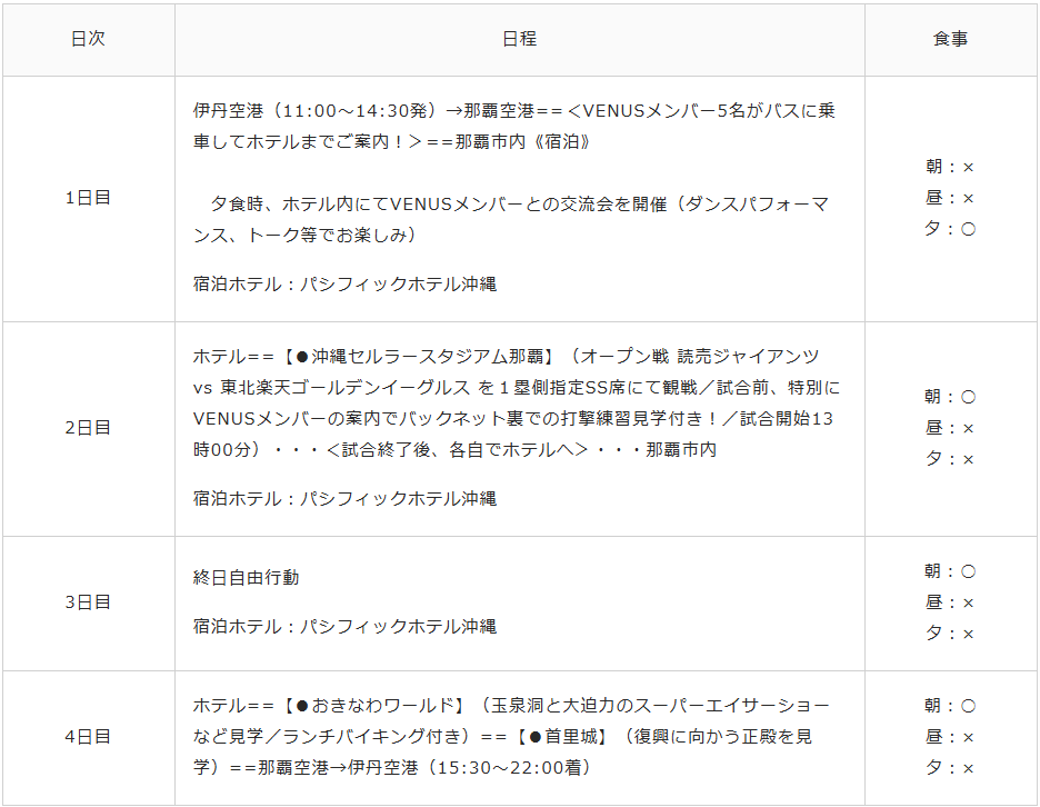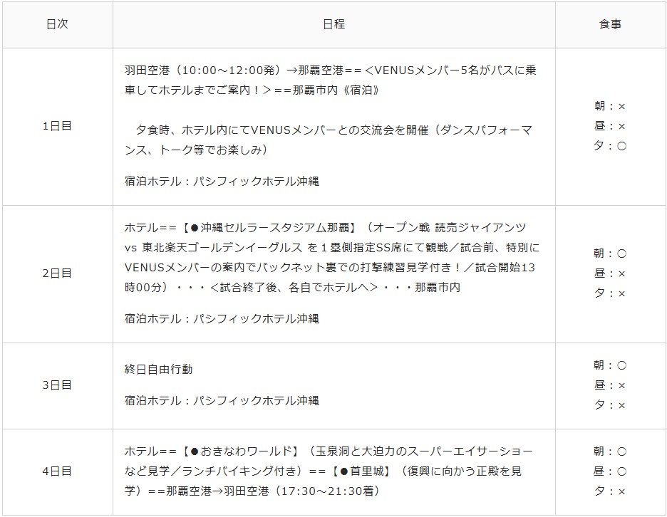 「推しのVENUSと一緒に特別な思い出を作りたい!」「沖縄キャンプの熱気を間近で感じたい!」そんなファンのために企画されたのが、この「≪推し旅≫」です。読売旅行ならではのネットワークを活かした、まさに一生モノの体験ができるツアーです!