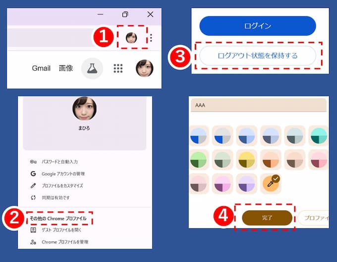 メニューが表示されるので、下部にある「その他のChrome プロファイル」をクリックします。 - ③ 「ログアウト状態で保持する」を選択